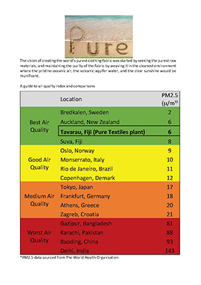 ピュアテクスが選んだフィジーという場所は、世界でも最高水準の空気と水に恵まれています。海からわずか120m、海抜20mの高さの場所に工場はあり、いちばん近い町から少なくとも15kmはあります。